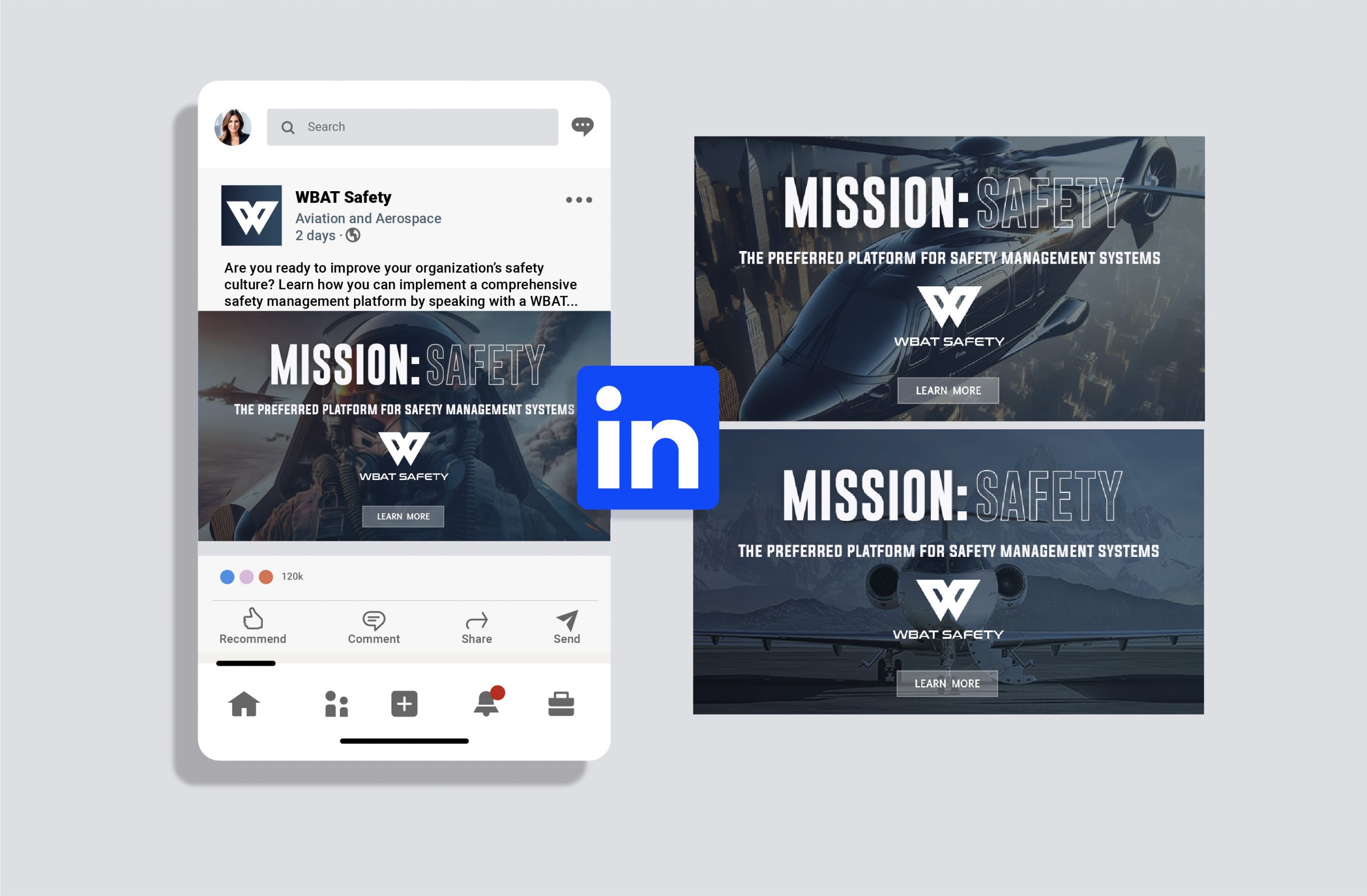 WBAT Safety, a web-based safety management solution, needed a unique logo to strengthen its brand and attract new clients. We built a brand that speaks to its audience and mission. Using a stable slate blue, reminiscent of aircraft, combined with a military-inspired font and an iconic “W” featuring a flight element, we forged a distinct identity. This resulted in a complete set of brand assets, from the logo and guidelines to social media graphics for various campaigns.